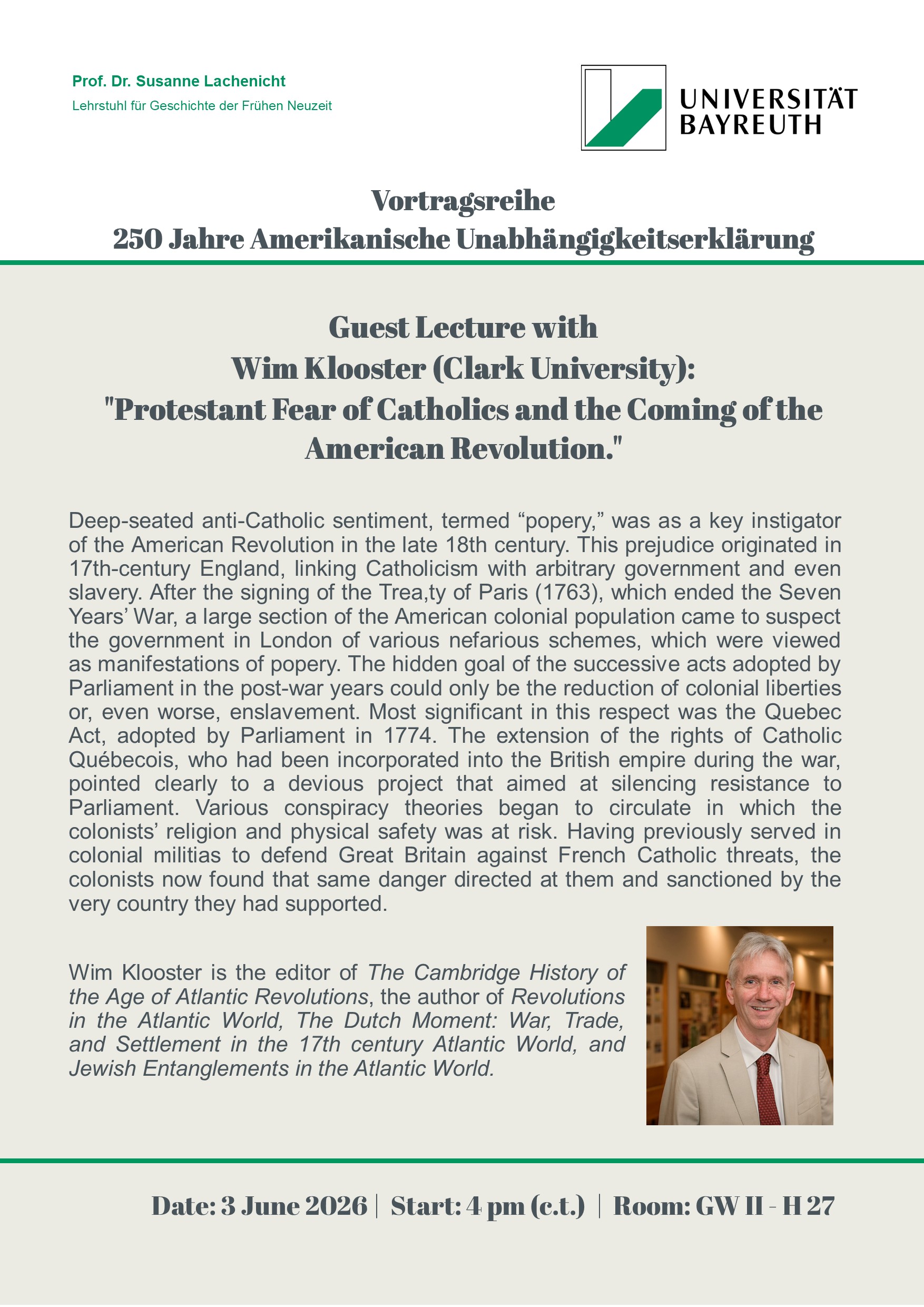 Gastvortrag von Wim Klooster (Clark University): "Protestant Fear of Catholics and the Coming of the American Revolution." am 3. Juni 2026 im H 27 (GW II)